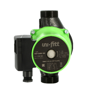 Трехскоростной циркуляционный насос Uni-fitt (Уни-Фит) SCP 32/60 180 с гайками применяется в закрытых и открытых системах отопления для обеспечения принудительного движения теплоносителя в контурах. Модель отличается компактными габаритами и может устанавливаться как вертикально, так и горизонтально. Корпус из высококачественного чугуна с антикоррозийным покрытием оснащен бесшумным роторным двигателем.