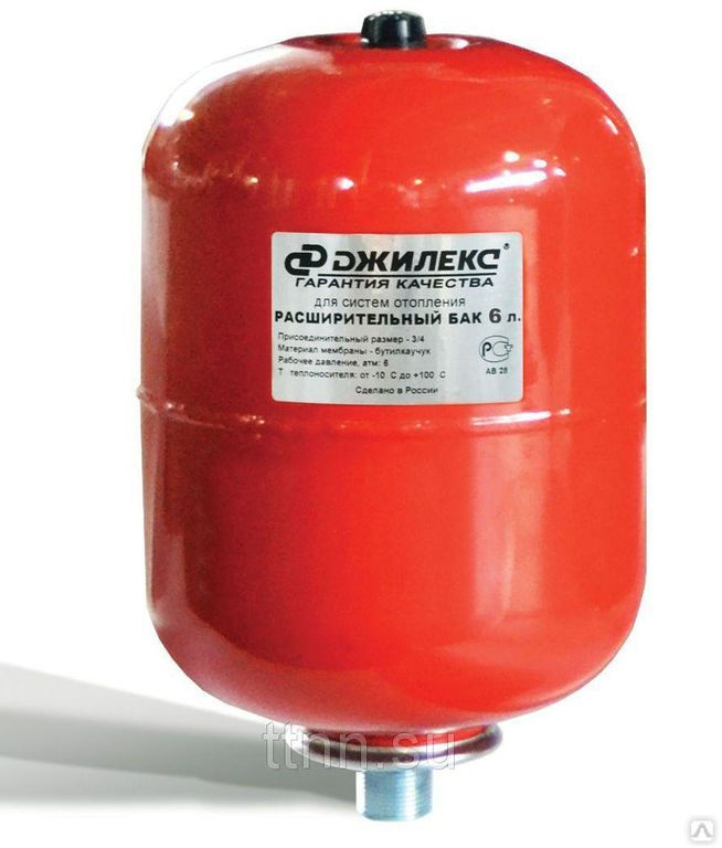 Бак расширительный Джилекс 6 л имеет металлический фланец, вертикальную компоновку и рекомендуется для компенсации температурных расширений теплоносителя и поддержания давления в замкнутых системах отопления.