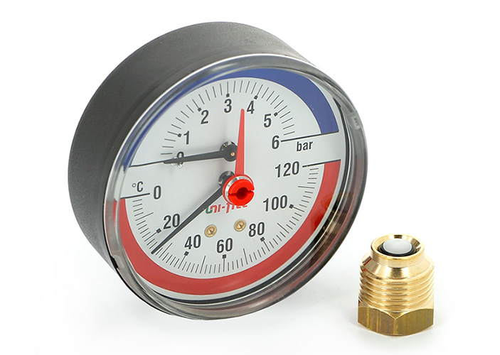 Аналоговый измерительный прибор для одновременного контроля давления и температуры в гидравлических системах. Оснащён двумя шкалами — для давления и температуры — и подходит для установки в системах отопления и водоснабжения.