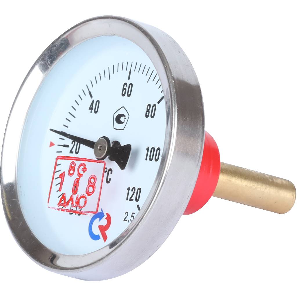 Биметаллический термометр для точного измерения температуры жидких и газообразных сред в инженерных системах. Оснащён защитной гильзой — позволяет демонтировать прибор без слива рабочей среды из системы.