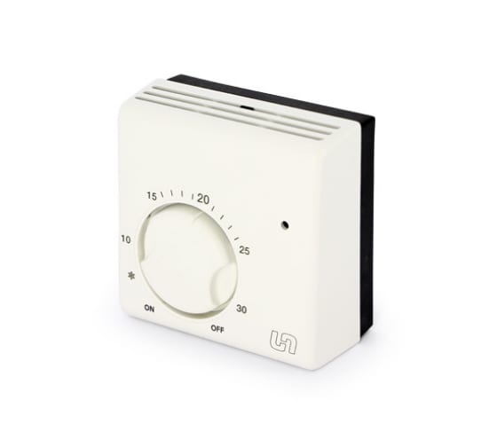 Механический комнатный термостат типа НО/НЗ (нормально открытый/нормально закрытый) для индивидуального управления температурой воздуха в помещении. Работает по встроенному датчику, коммутирует электрические цепи управляемых устройств: термоэлектрических или сервоприводов, насосов, котлов и т. д.